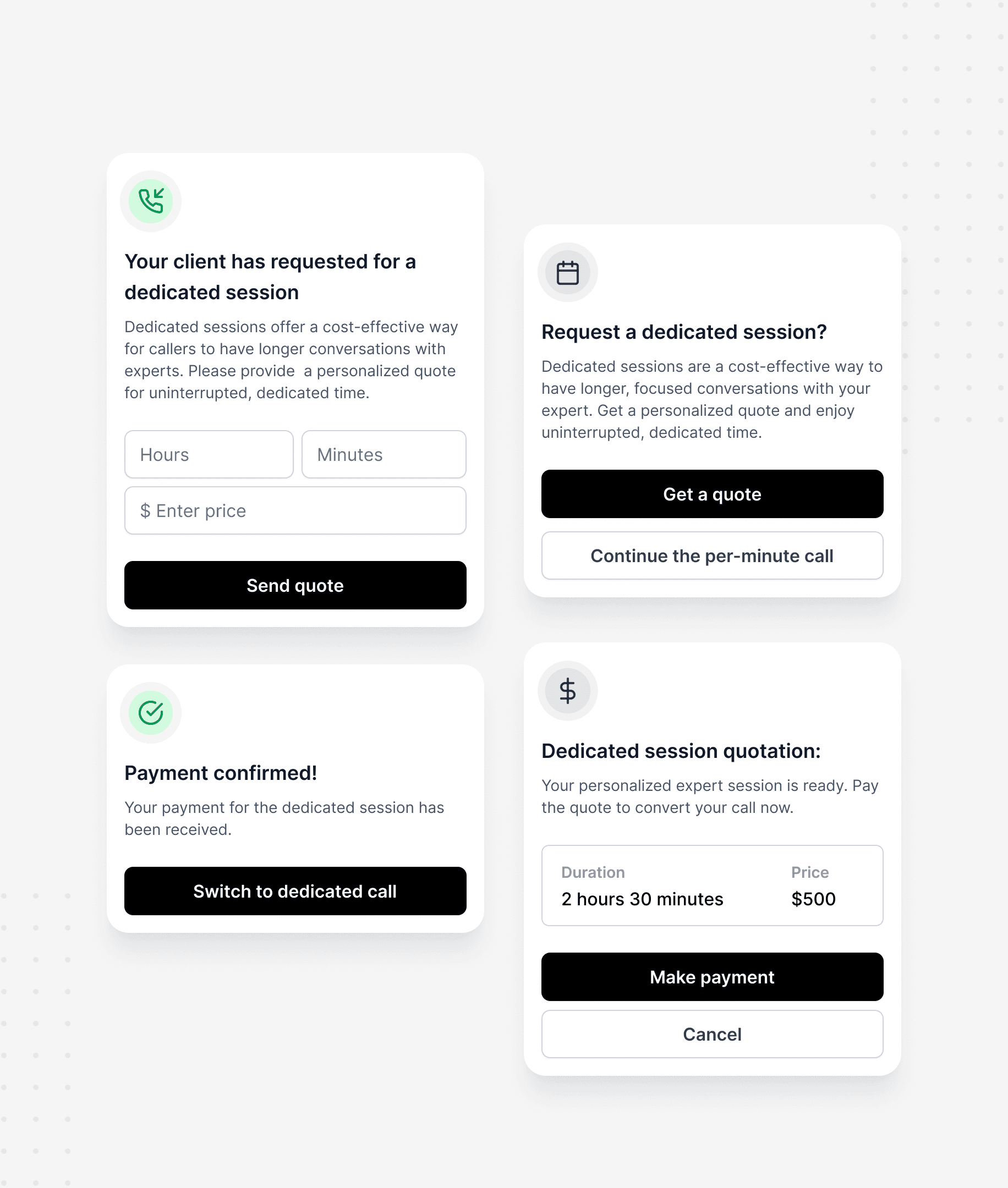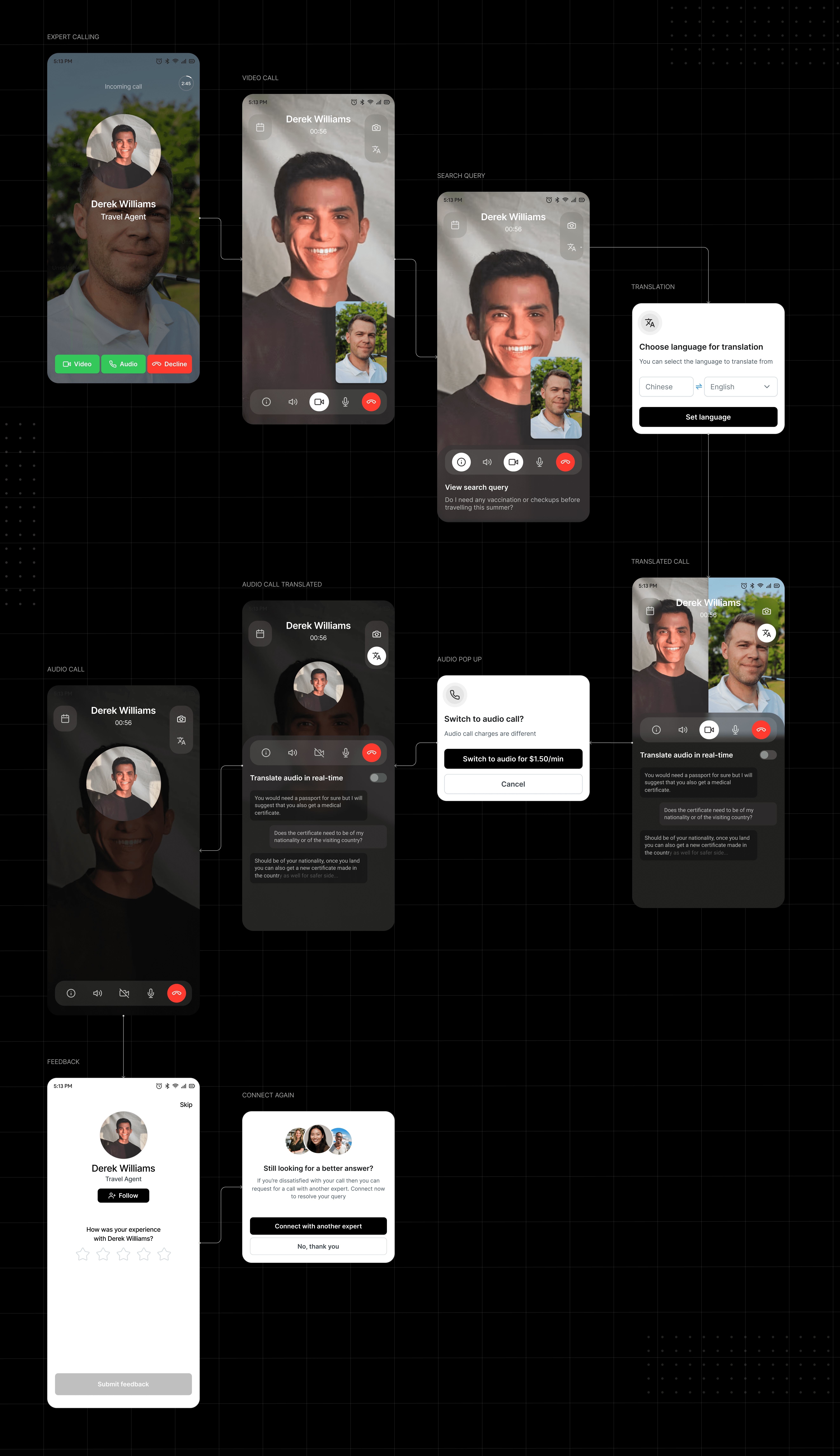 Our solution features an intuitive mobile-first interface with four key components: smart expert matching, multilingual video/audio consultations, seamless in-person scheduling, and integrated financial management. The minimalist design—with clean typography, ample white space, and focused interactions—makes the complex feel simple. We designed for clarity across diverse industries, enabling users to discover, connect with, and pay experts in just a few taps.
