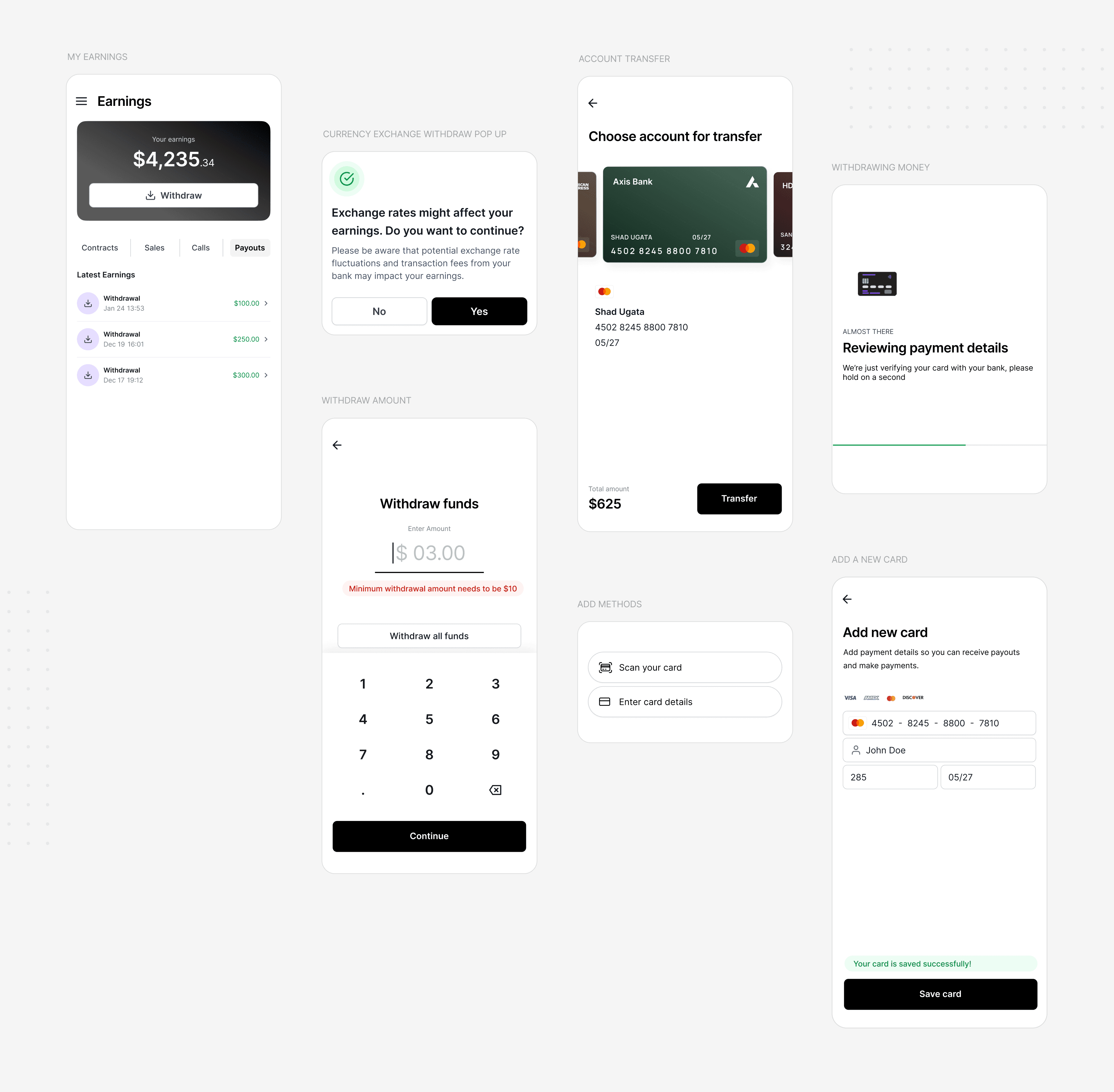 We designed a complete financial ecosystem within Jobrooms. Clients can top up their wallets to pay for expert consultations, while tracking their spending patterns over time. For experts, we created an earnings dashboard that monitors income and facilitates withdrawals to their chosen bank accounts. This dual-sided financial tracking system provides transparency and security for all transactions, regardless of currency or location.